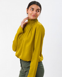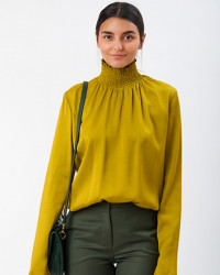 Blusa de color mostaza con cuello fruncido elástico, manga larga y aberturas laterales en costados.