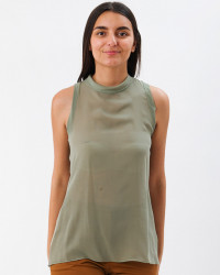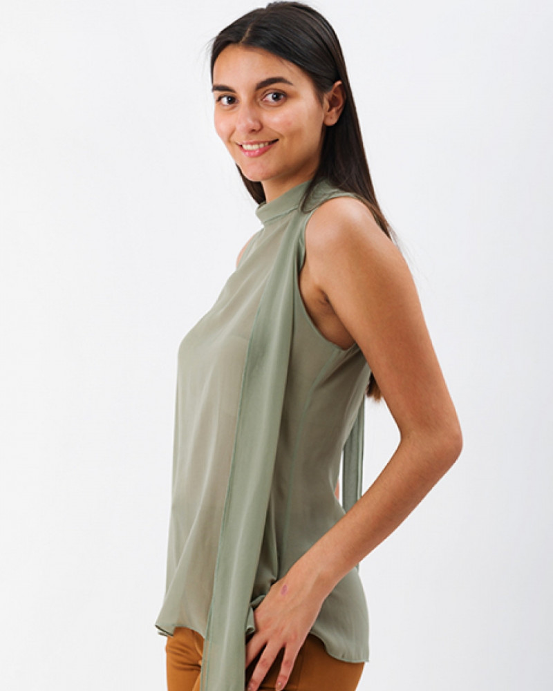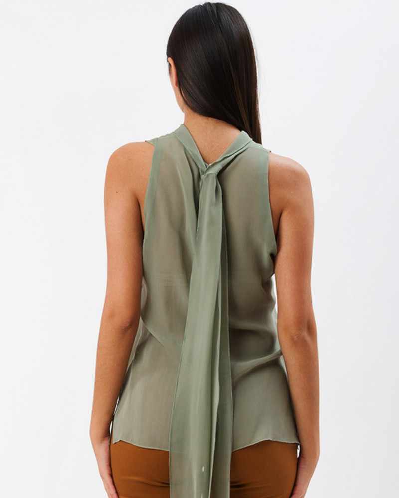 Cuerpo sin mangas de tejido georgette traslucido en color verde.