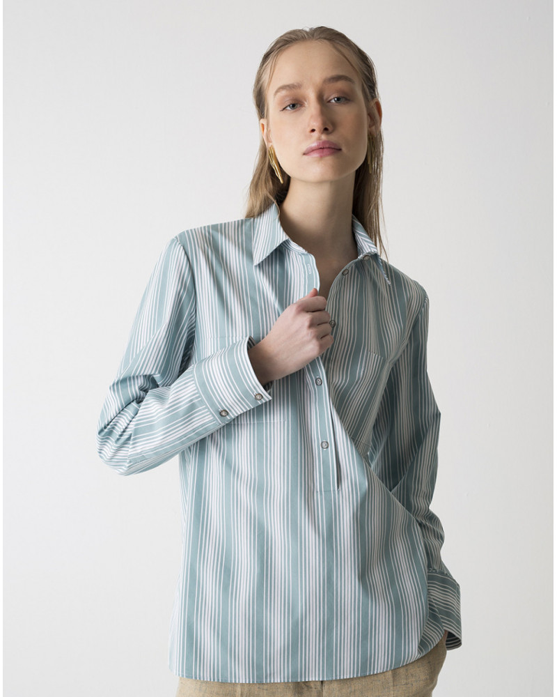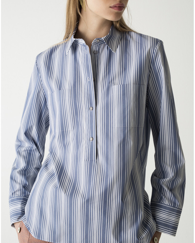 Camisa confeccionada en mezcla de algodón y seda. Corte recto y tapeta tipo polo en la parte delantera. Manga larga acabada en puño abotonado y dos bolsillos frontales de parche sin solapa.