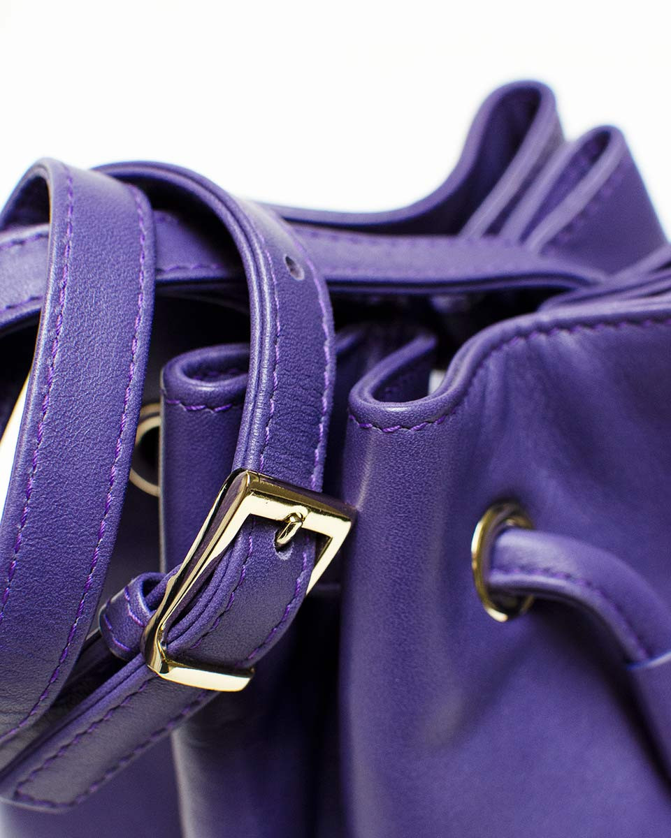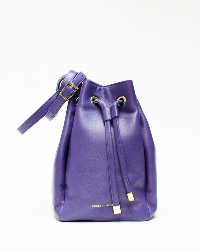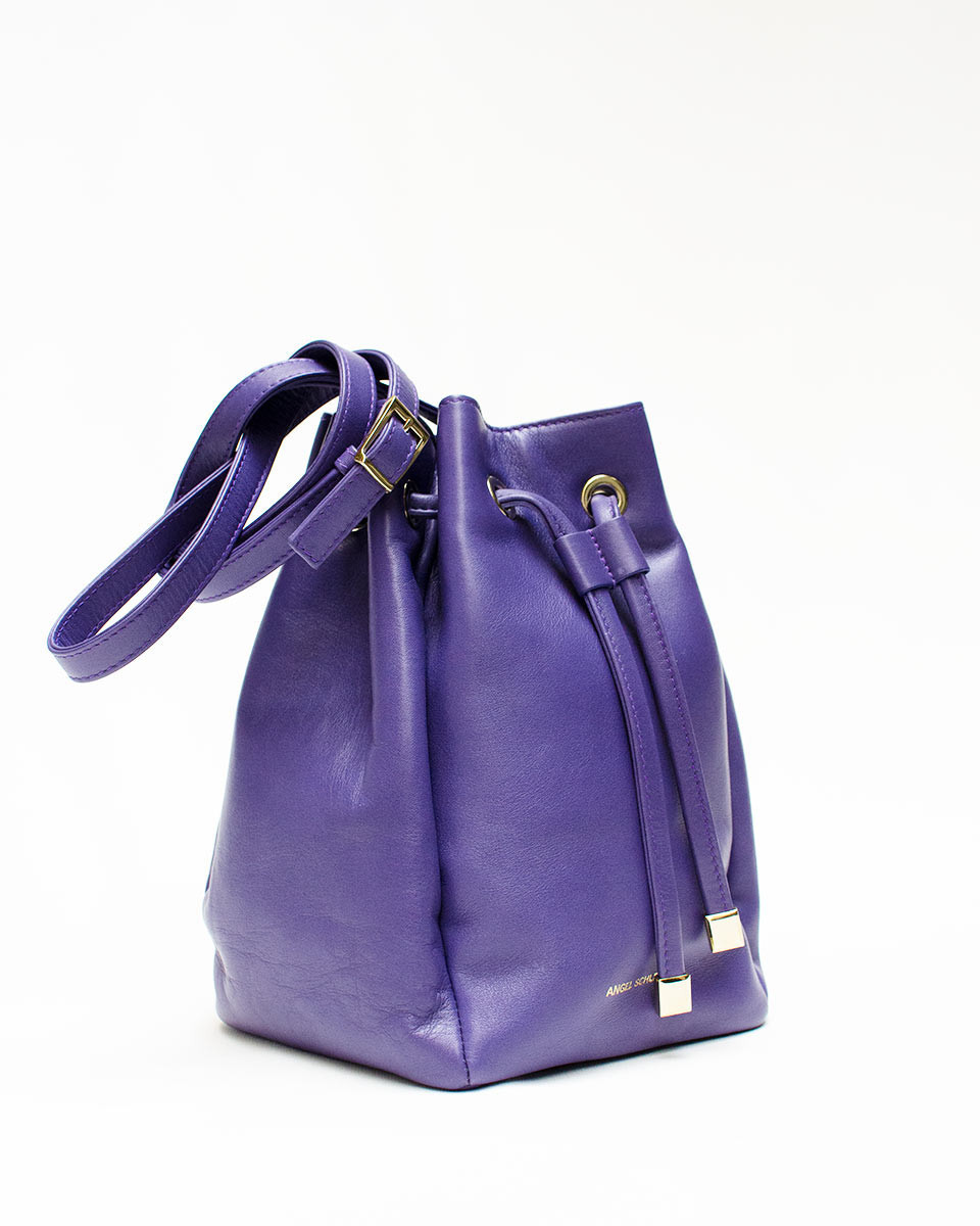 Bolso bowling en piel bolsillo con cremallera en color morado.