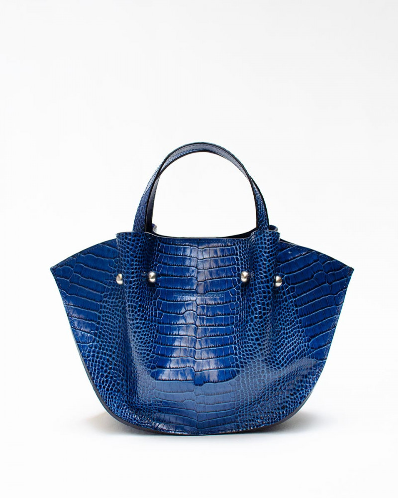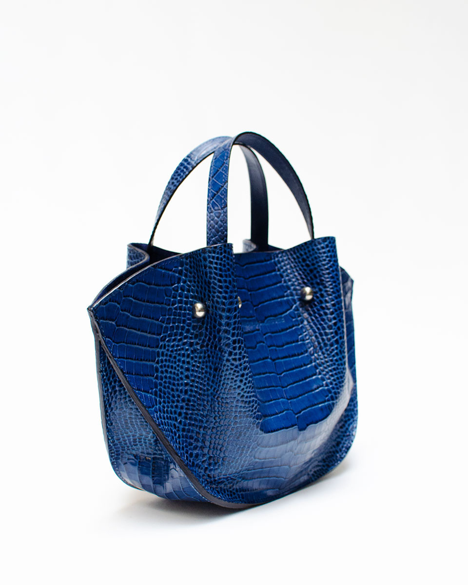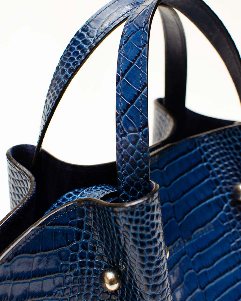 Bolso estilo capazo en piel con efecto cocodrilo.