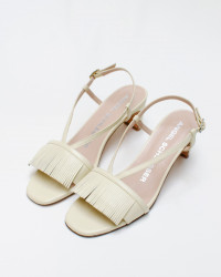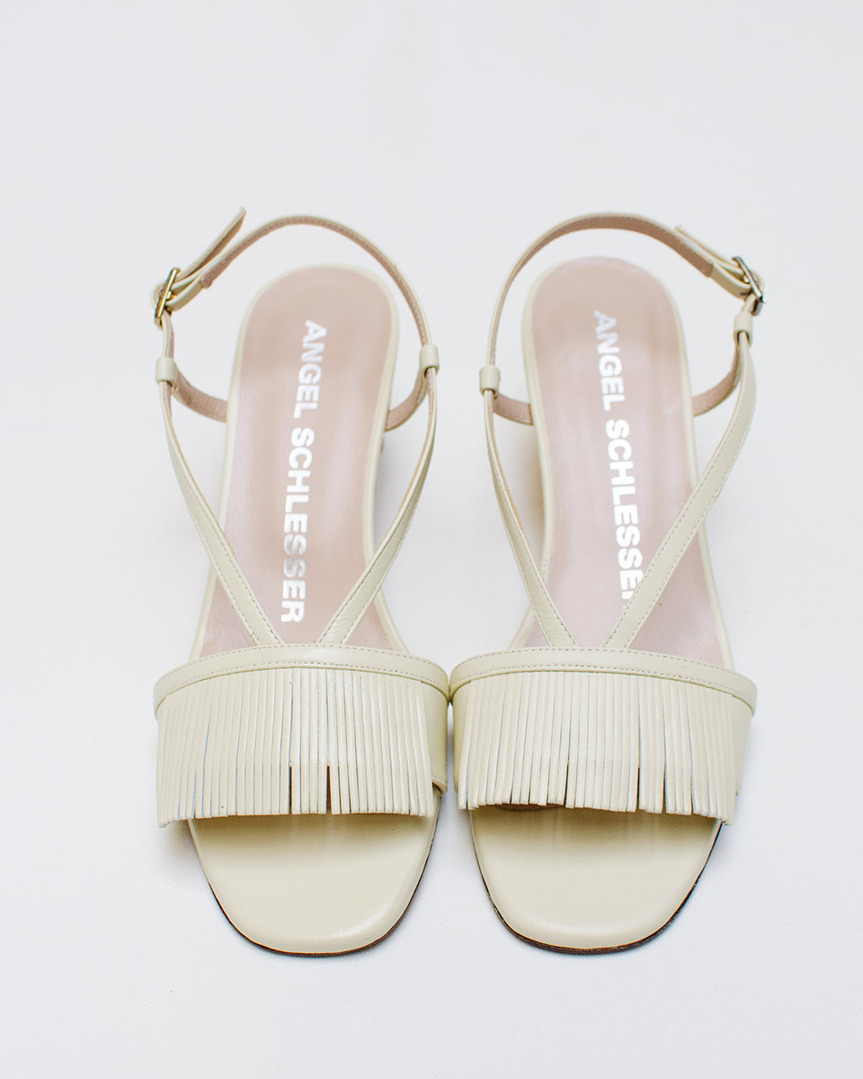 Sandalia de tacón bajo detalles frontales con flecos. Zapato y suela al completo en piel de gran calidad.