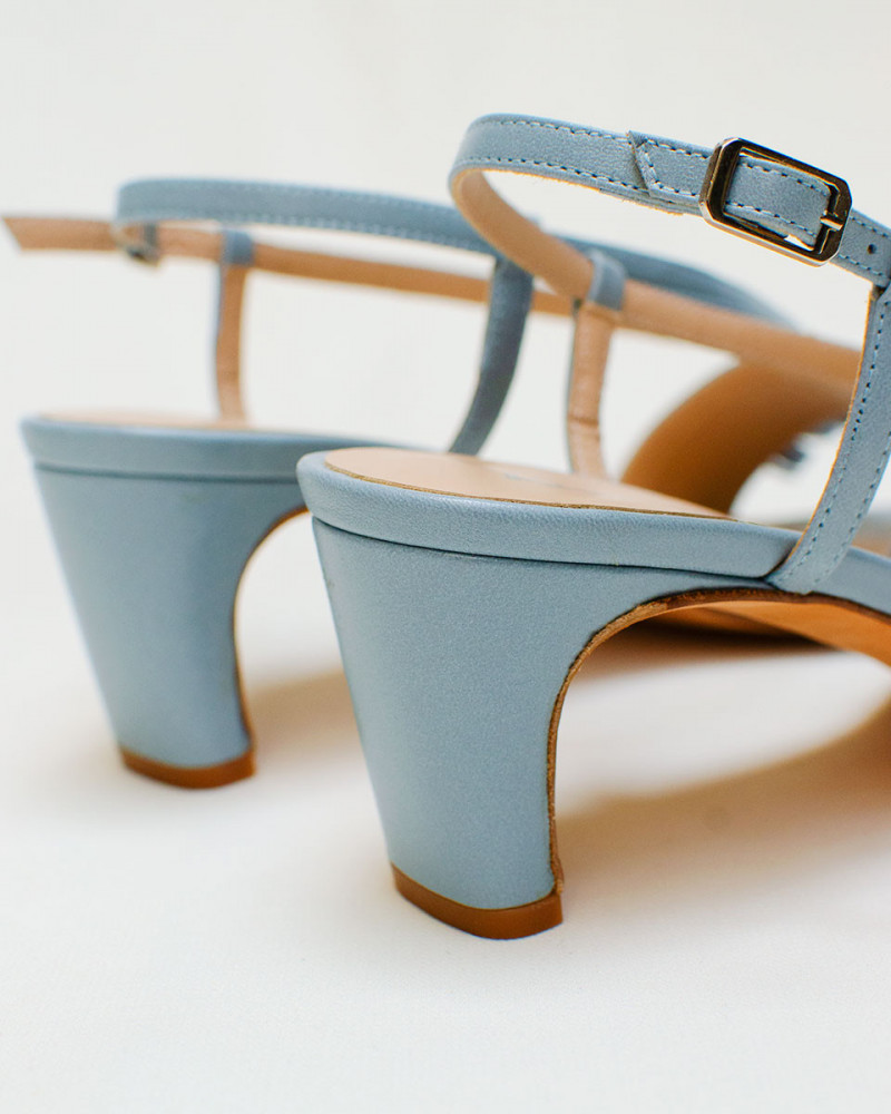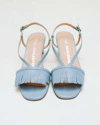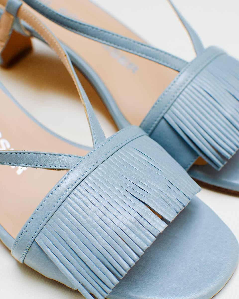 Sandalia de tacón bajo detalles frontales con flecos.
