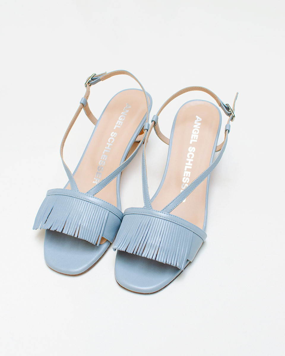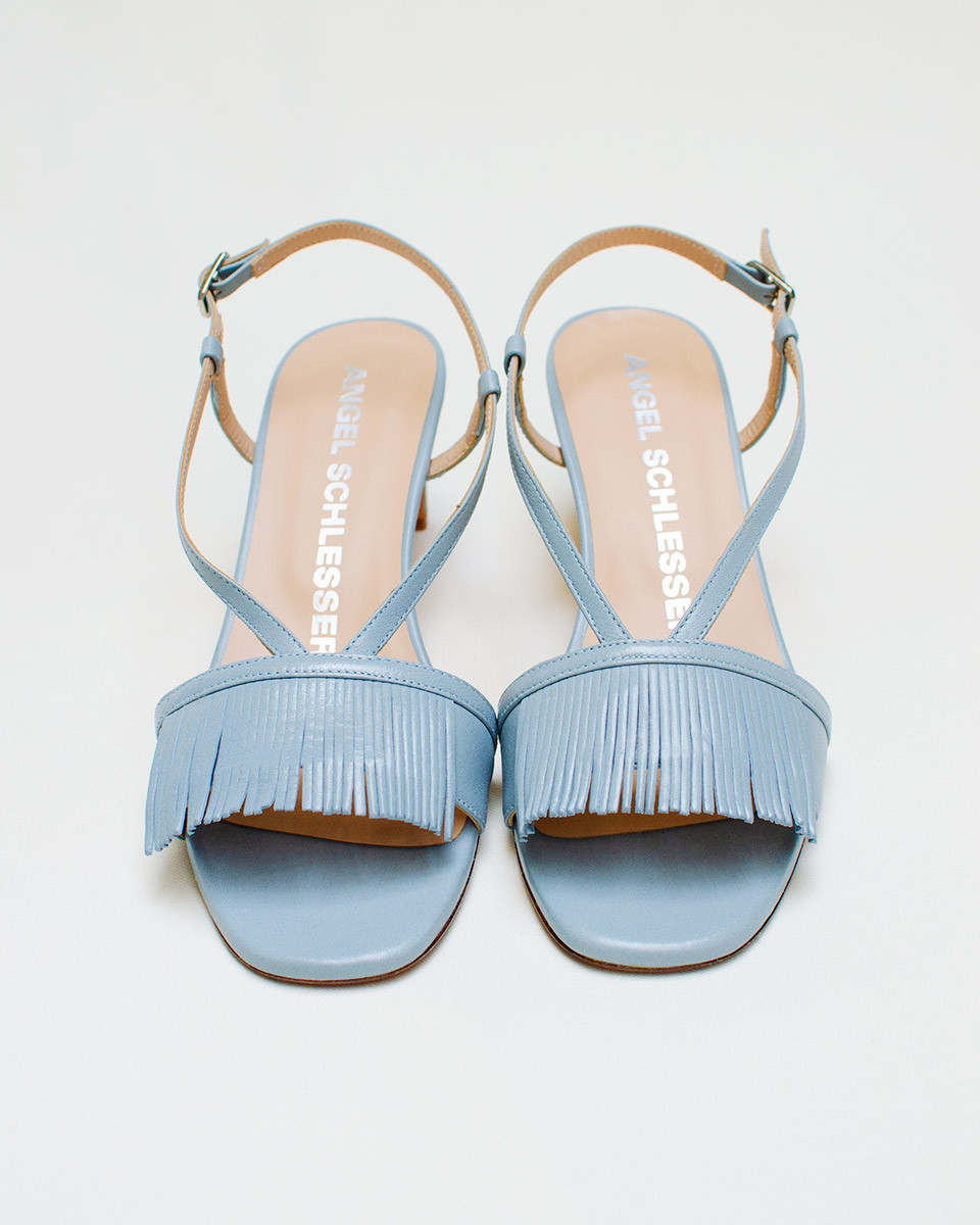 Sandalia de tacón bajo detalles frontales con flecos. Zapato y suela al completo en piel de gran calidad.
