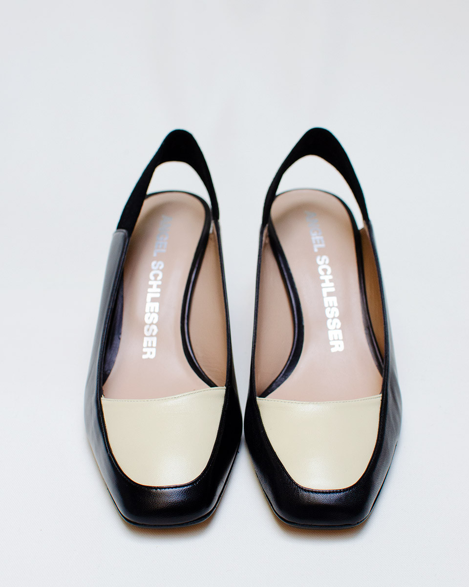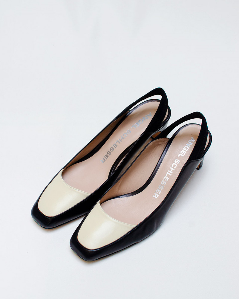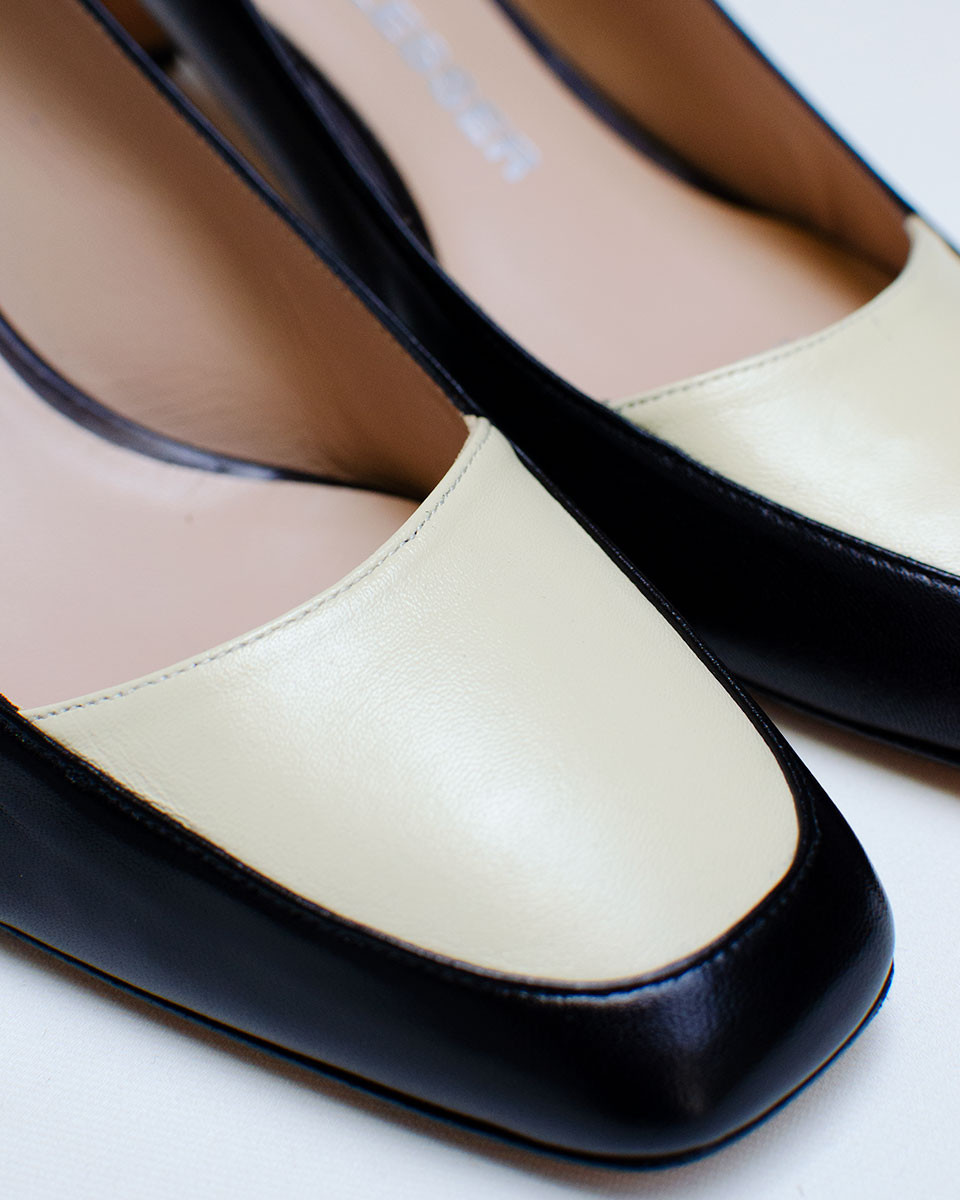 Zapato destalonado en tonos bicolor. Pieza posterior que proporciona una buena sujeción. Tacón de 4cm perfecto para uso diario y para ocasiones en las que quieras sentirte más especial. Zapato y suela al completo en piel de gran calidad.