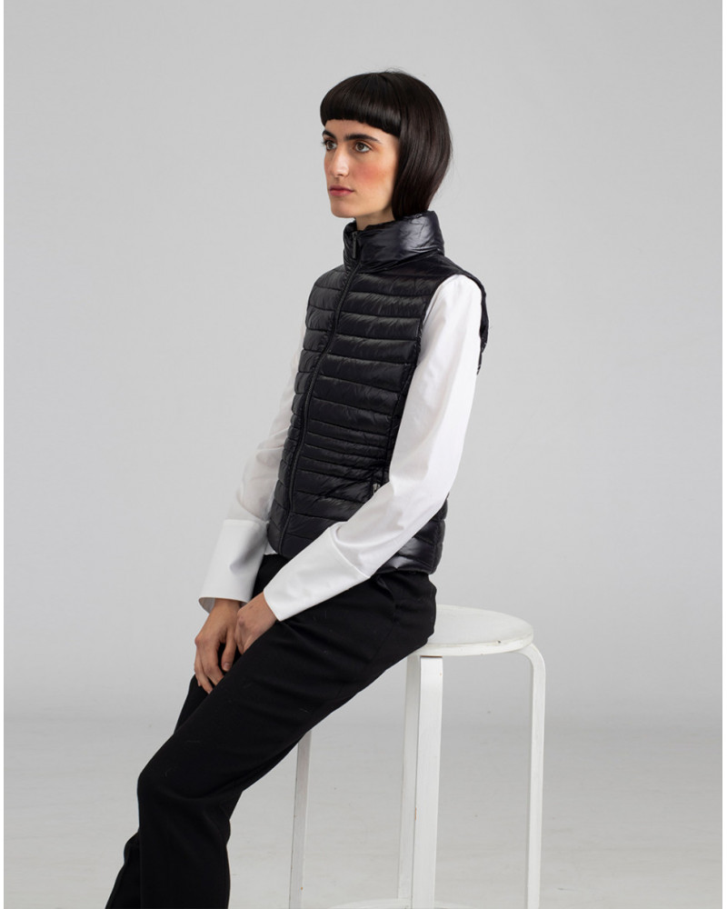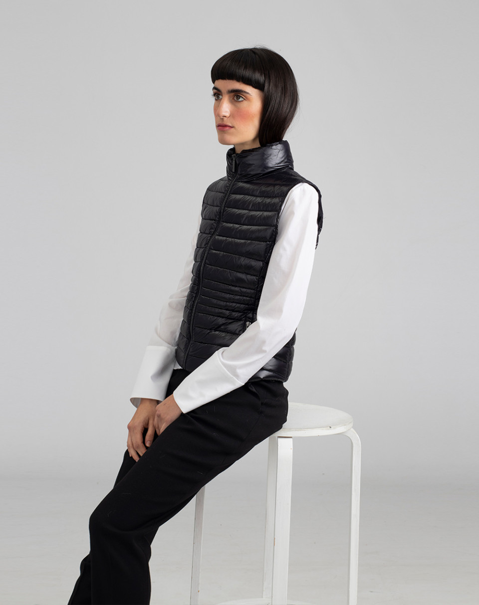 Chaleco plumas en color negro, cierre con cremallera frontal y cuello subido. Con bolsillos laterales con cierre de cremallera metálica.