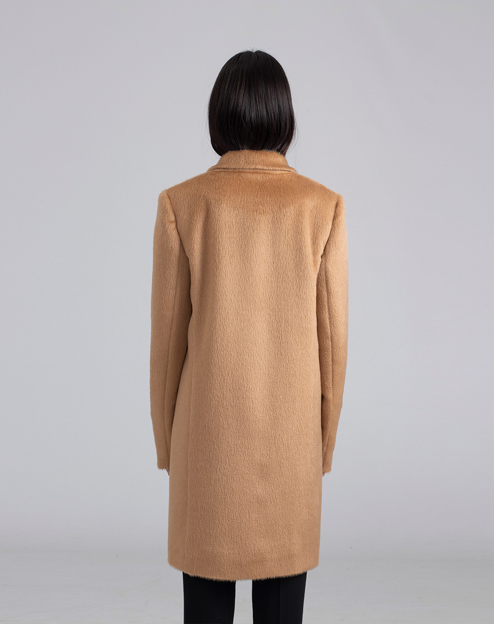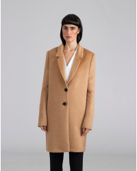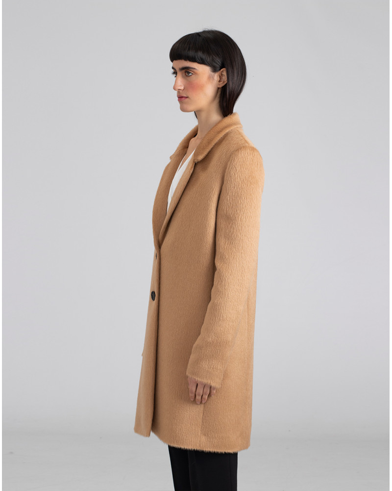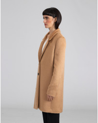 Abrigo camel confeccionado en mezcla de alpaca y lana virgen efecto pelo, de corte recto y con solapa fina. Cierre frontal con un botón.