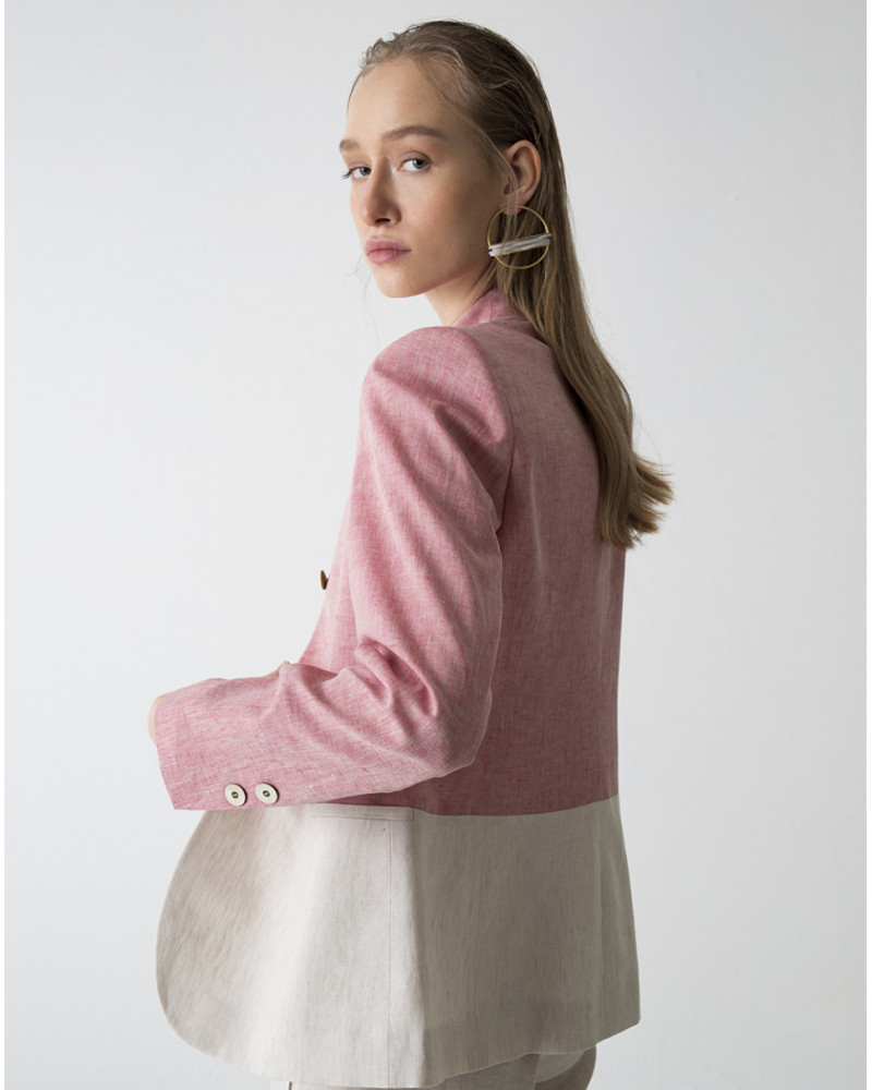 Chaqueta bicolor de lino 100%. Con cierre frontal mediante botones, sin solapa y con bolsillos delanteros de doble vivo.