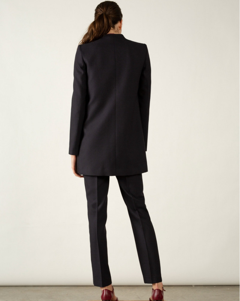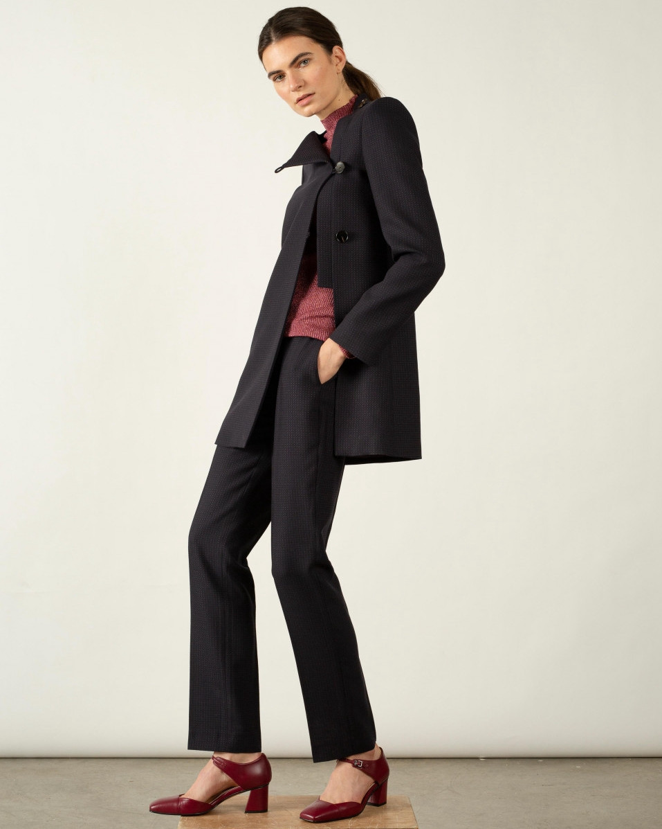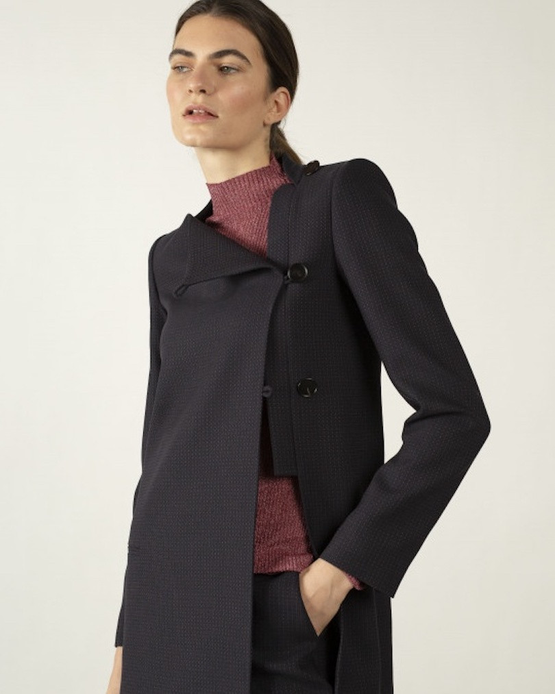 Chaqueta larga estilo perfecto, con botonadura lateral y abertura besada. Tiene escote cuadrado y está confeccionada en lana virgen 100%.