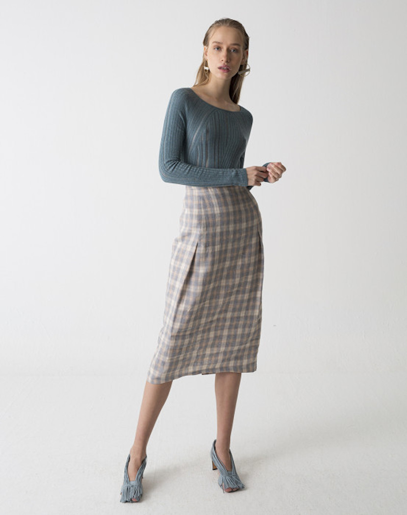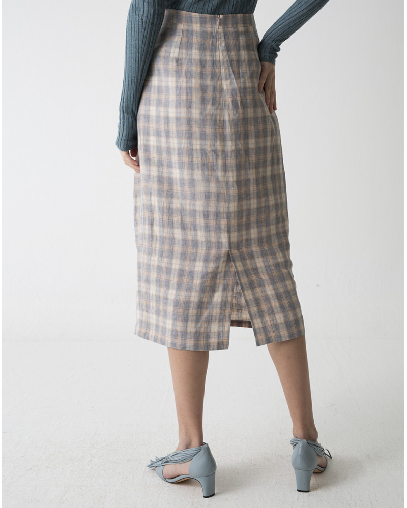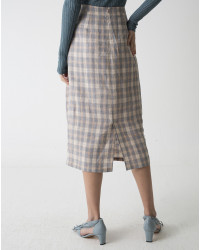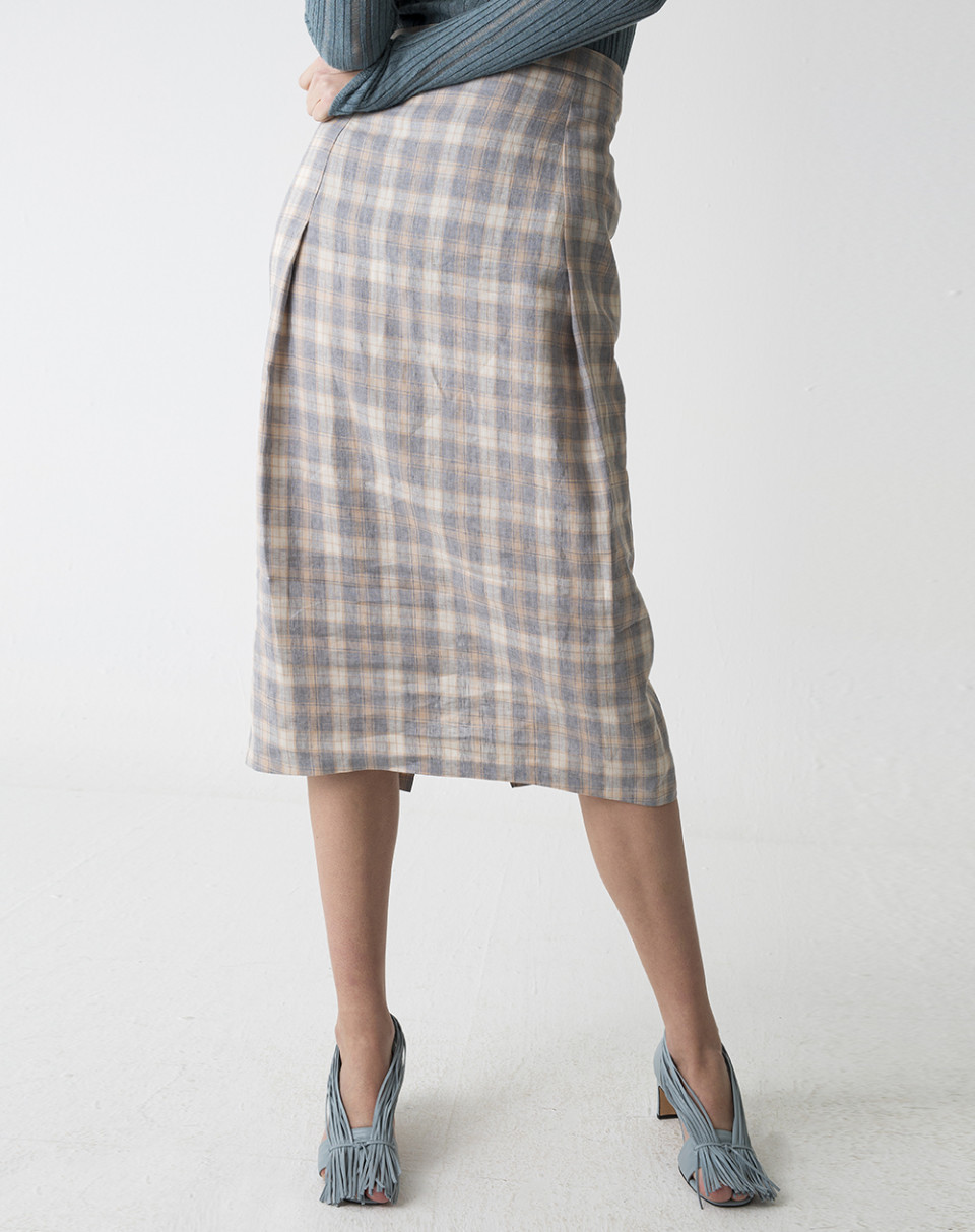 Falda midi confeccionada en lino 100% con estampado en cuadros y pliegues laterales. Con cierre trasero mediante cremallera invisible.