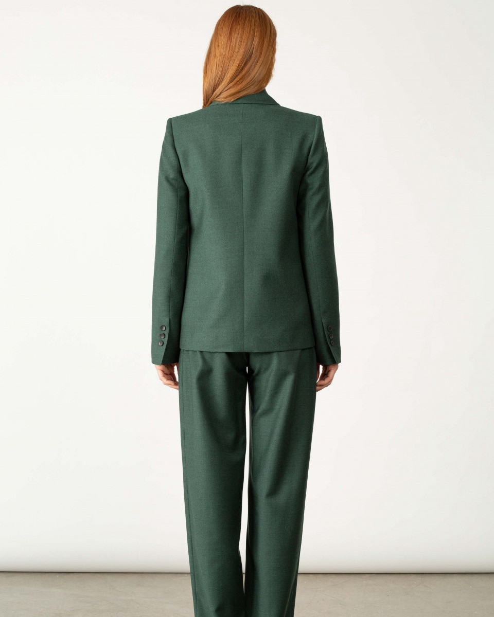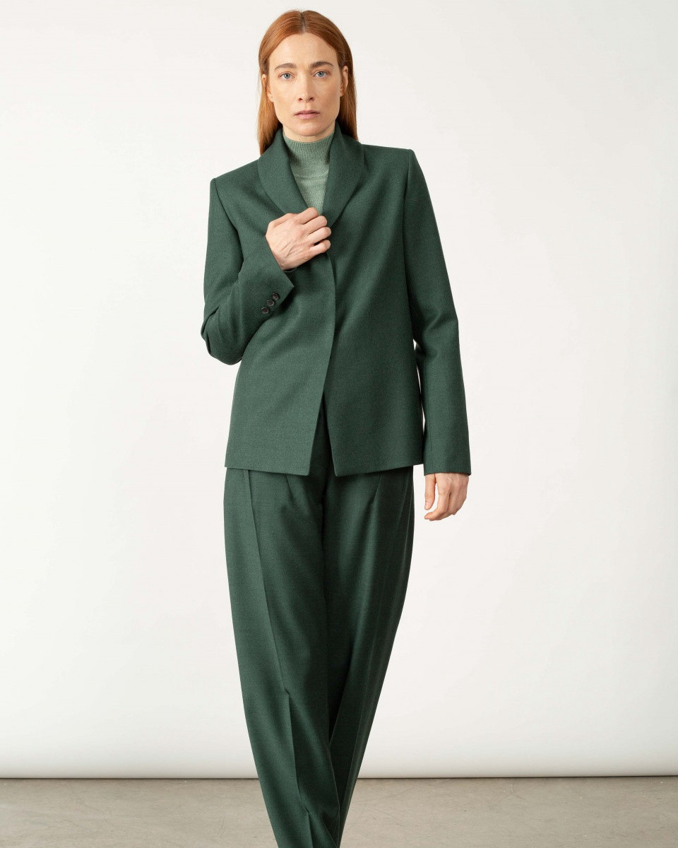 Pantalón de tiro medio y pernera ancha que se estrecha en la parte inferior para alargar la silueta. Con pliegues oblicuos para aportar fluidez a esta prenda confeccionada en lana virgen 100%.