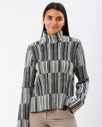Jersey punto jacquard con estampado geométrico de color blanco y negro; Cuello chimenea y aberturas laterales en costados y mangas anchas.