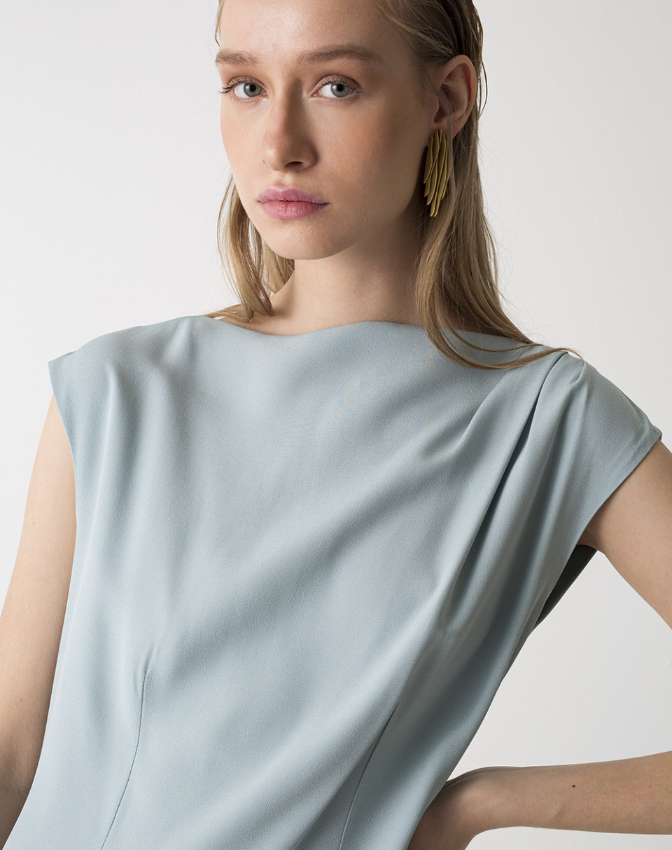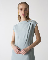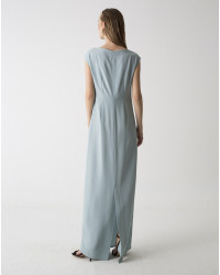 Vestido largo con cuello barco y detalle de fruncido en el hombro. Cierre mediante cremallera en la espalda y abertura en el bajo.