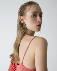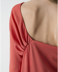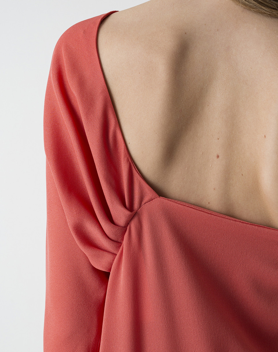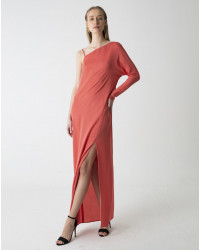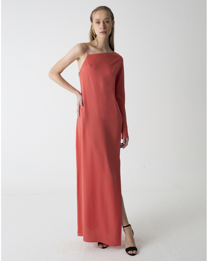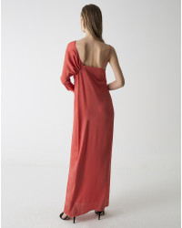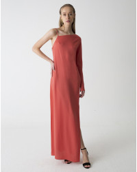 Vestido largo confeccionado en seda 100%. Escote asimétrico con un tirante y manga larga con fruncido en la parte trasera. Bajo con abertura lateral.